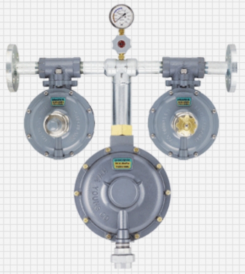 这是把自动切断部和2级调压器合在一体的调压器。在自动切断部降一次容器压力后,再到2级调压器降到使用压力。这是一个把压力调整到适当燃烧的2级减压方式调压器。